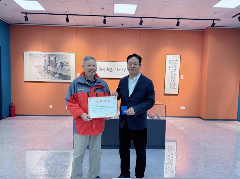 2025年11月28日,我校优秀教师刘幼仙女士的儿子唐苏艺老师得知湖艺美术馆开馆讯息后特来校参观,并向学校捐赠了母亲刘幼仙老师留存给自己的唯一遗物——借书证。